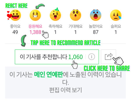 2. Click the [2nd] second emoji. [First emoji is also a positive emoji but it requires more reaction which means it makes it more difficult to trend using the first reaction. Therefore, always react and click SECOND EMOJI whenever it's an INDIVIDUAL ARTICLE. React with the FIRST EMOJI only when it is an OT8 ARTICLE. Never click the fifth or sixth emoji to react on a positive article as it is the alternative for dislike button.]